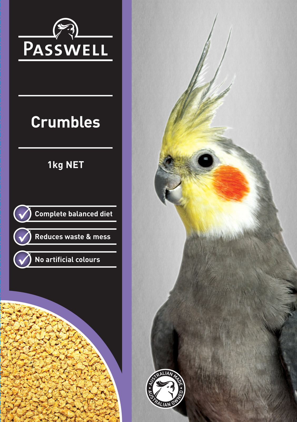 Crumbles are a balanced diet for small parrots, budgies, lovebirds, canaries, finches, quail & doves.
